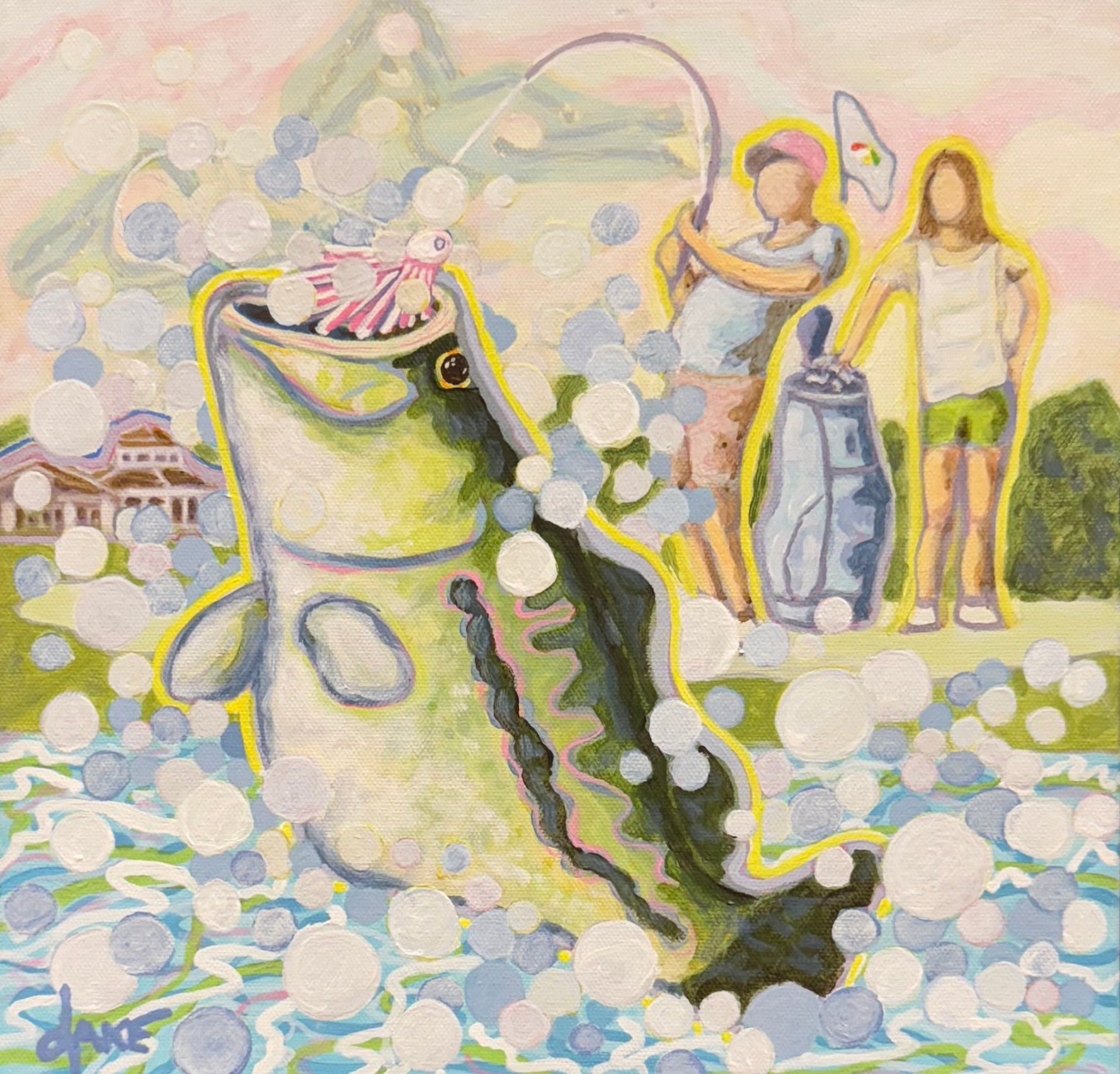 Presenting “Bayhill Bass,” a one-of-a-kind 12x12" acrylic on canvas by artist Brian Lake. With vibrant colors and a unique perspective, this piece captures the excitement of both golf and bass fishing in a playful and unexpected way. Perfect for any avid angler or golf enthusiast.